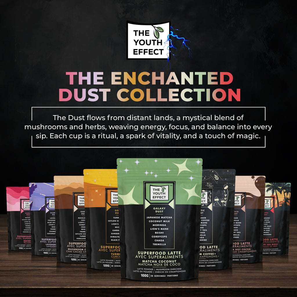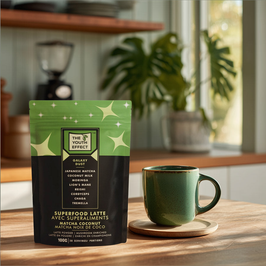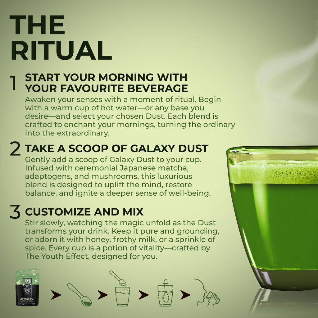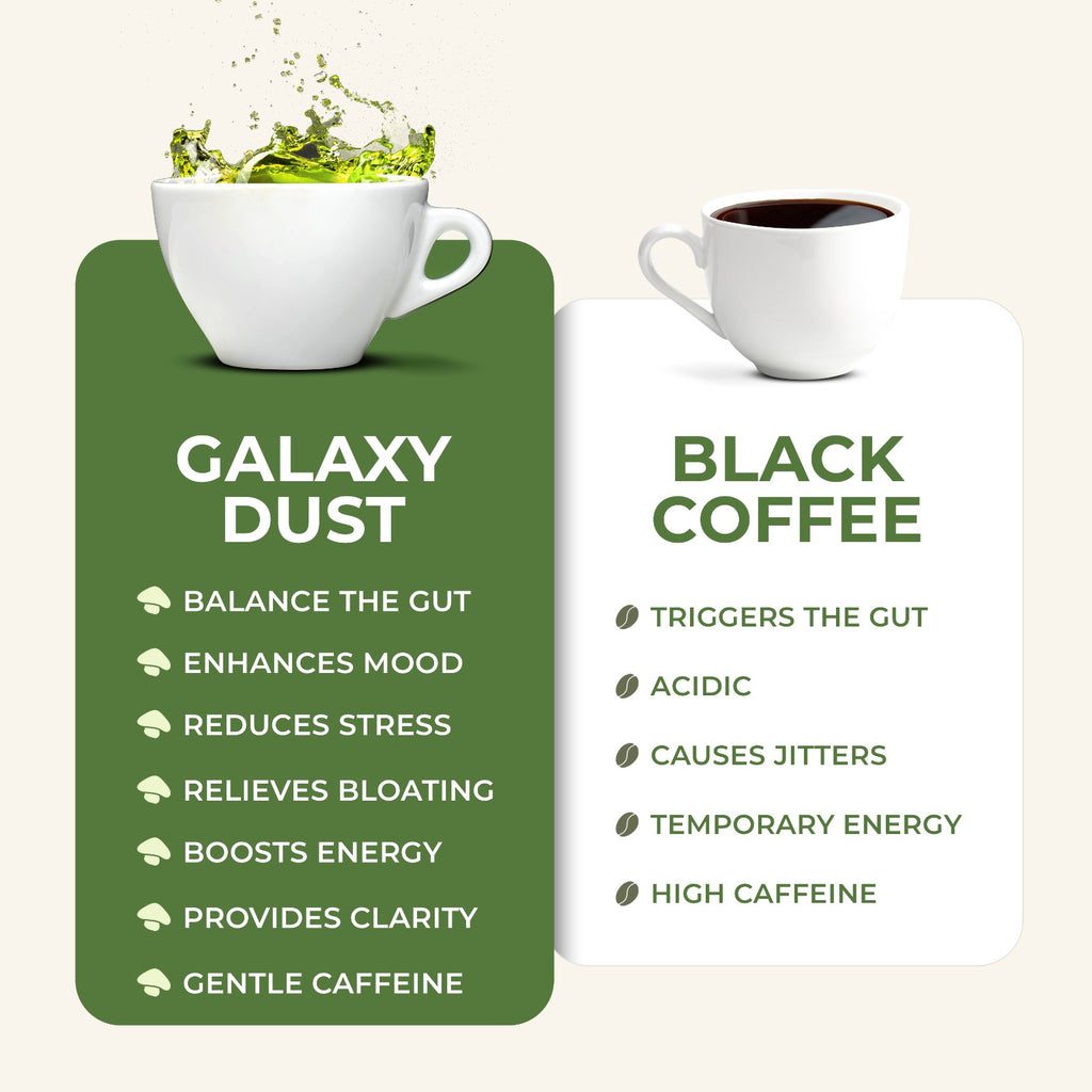 Unlike regular coffee, Galaxy Dust delivers steady, focused energy without jitters or crashes. Each cup soothes digestion, eases stress, and promotes mental clarity, while providing a gentle and sustained lift. With the balanced caffeine of premium Japanese matcha and the added benefits of adaptogenic mushrooms, it transforms your daily ritual into a cosmic experience—keeping you centered, sharp, and vibrant. We’ve also blended in creamy coconut milk and nutrient-rich moringa to support whole-body wellness, making every sip smooth, satisfying, and otherworldly.