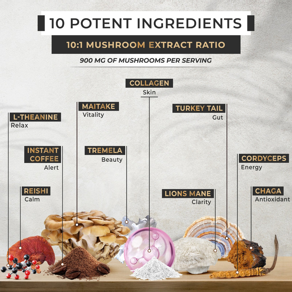 Unlike regular black coffee, Mystic Dust supports body and mind without harsh side effects. Each cup soothes the gut, calms stress, and promotes mental clarity, while providing a gentle, sustained energy boost. With half the caffeine of traditional coffee and adaptogenic mushrooms, it transforms your daily ritual into a balanced experience—keeping you energized and focused. We’ve also added high-quality, hydrolyzed collagen peptides, tested free from toxins and heavy metals, to support radiant skin, joint health, and overall wellness in every smooth, satisfying cup.
